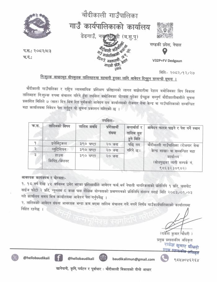 » निःशुल्क आधारभूत सीपमुलक तालिमहरुमा सहभागी हुनका लागि आवेदन दिनुहुन सम्बन्धी सूचना ।