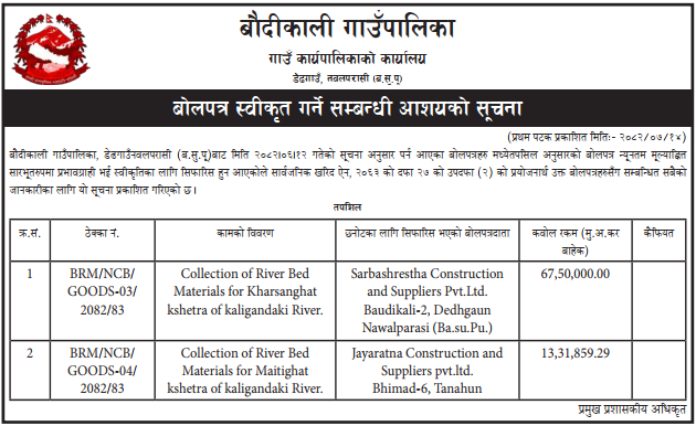 » बोलपत्र स्वीकृत गर्ने सम्बन्धी आशयको सूचना ।