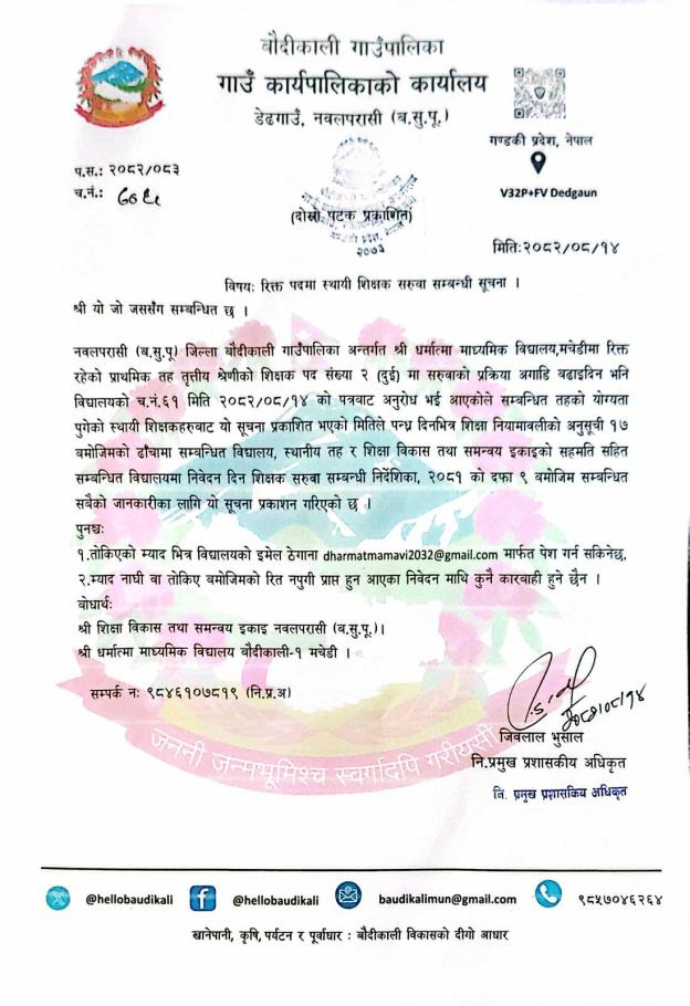 डेढगाउँ मा.वि. , बौदीकाली-२, डेढगाउँ, नवलपुरमा शिक्षक आवश्यकता सम्बन्धि सूचना