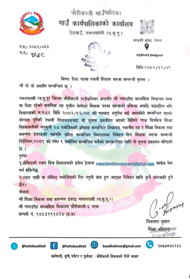 डेढगाउँ मा.वि. , बौदीकाली-२, डेढगाउँ, नवलपुरमा शिक्षक आवश्यकता सम्बन्धि सूचना