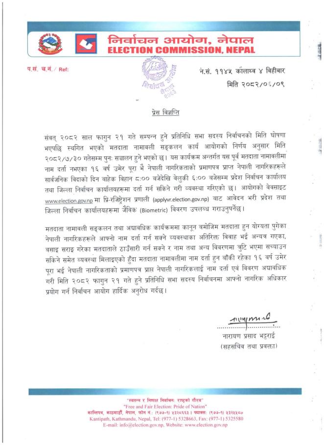 » निर्वाचन आयोग, नेपालको मतदाता नामावली दर्ता तथा अद्यावधिक कार्य सुचारु भएको सम्बन्धी सूचना ।