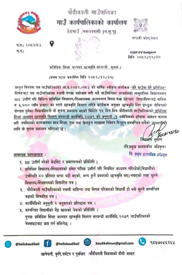 बाौदीकाली गाउँपालिकाको विद्यालय अनुमति सम्बन्धि सुचना