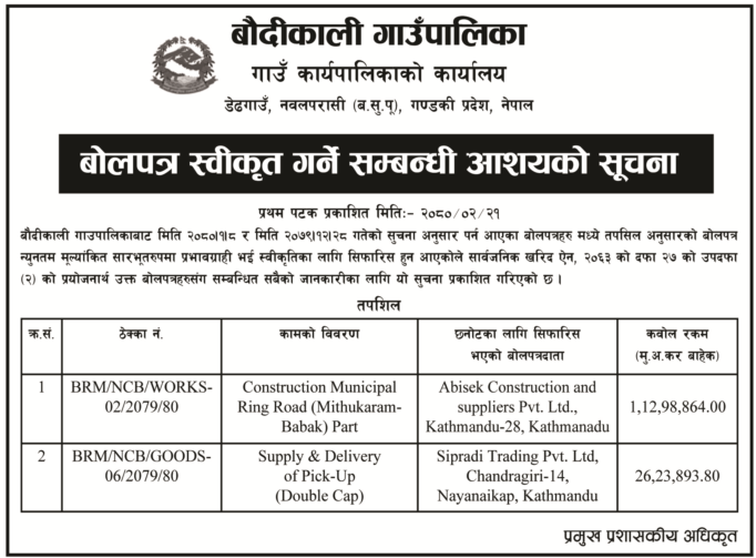 बोलपत्र स्वीकृत गर्ने सम्बन्धी आशयको सूचना ।