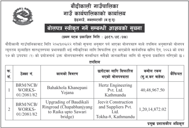 बोलपत्र स्वीकृत गर्ने सम्बन्धी आशयको सूचना ।