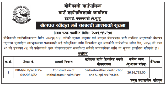 बोलपत्र स्वीकृत गर्ने सम्बन्धी आशयको सूचना ।