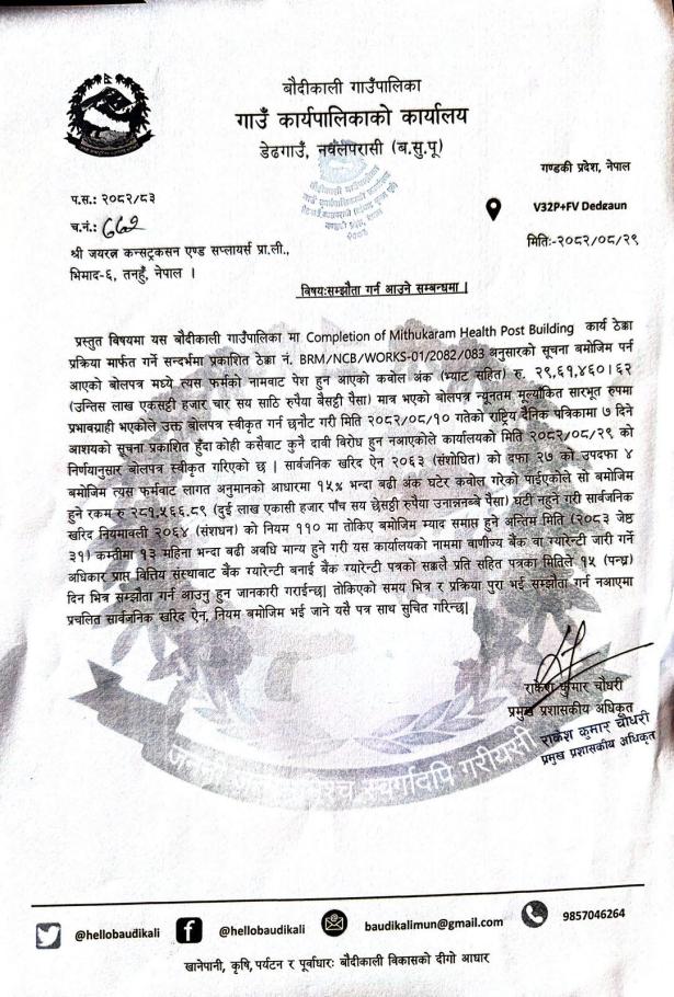 बोलपत्र स्वीकृत गर्ने सम्बन्धी आशयको सूचना ।