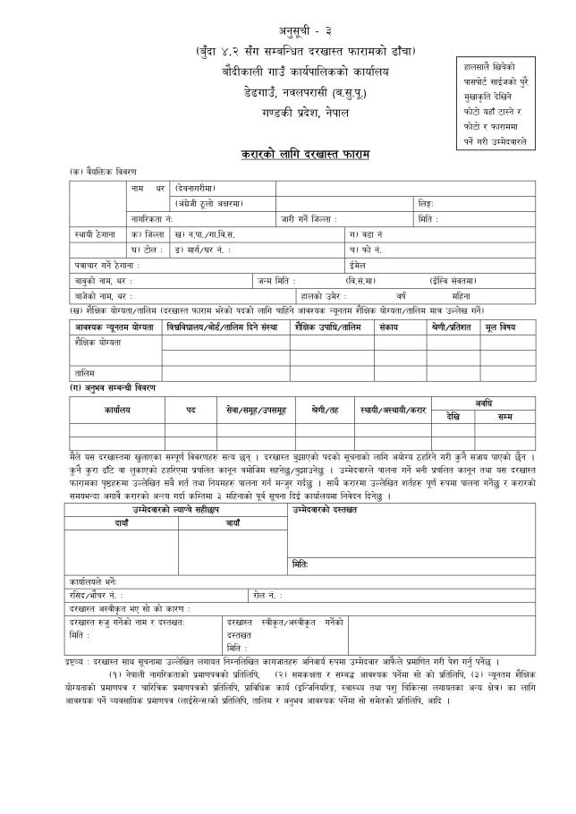 प्रधानमन्त्री रोजगार कार्यक्रमको न्युनतम रोजगारीमा संग्लग्न हुनको लागि निवेदन दिने बारे सूचना । साथै बेरोजगार व्यक्तिले दिने निवेदन फारम यसै साथ राखिएको छ ।